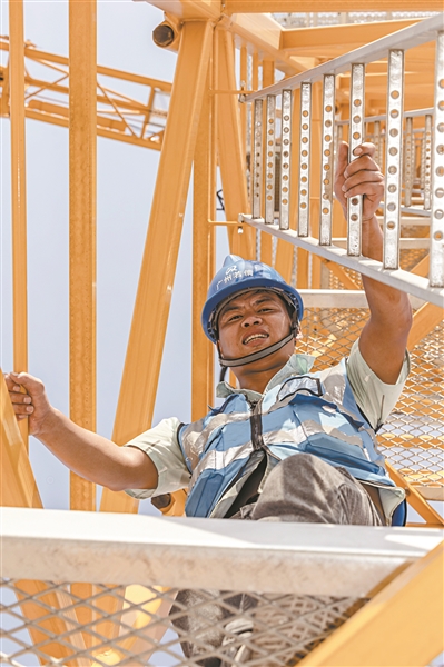 黝黑的皮膚上泛著汗珠,架子工劉何俊正撐起被曬得燙手的鐵管,雙腳立在只有半米長的鐵管頭上,伸出雙手一次次地接著從下面投上來的固件,把每一個接頭擰緊。他說:“雖然高溫工作很辛苦,但是一想到這項工程建成后的模樣,心里油然而生一種榮譽感,就什么苦也不怕,累并快樂著?!?/p>