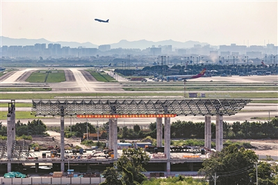 7月24日,在白云機場T3航站樓施工現(xiàn)場,烈日當空,轟鳴的飛機頻頻掠過。在距離機場跑道不到一公里的地方,花冠造型的工地上,工人們正在揮汗如雨搶進度。