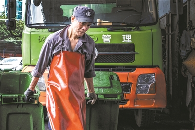 7月5日,解放中路,環(huán)衛(wèi)工人將一桶桶的廚余垃圾轉運上車。