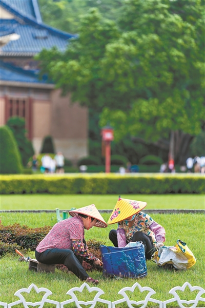 7月7日,中山紀念堂前的草坪上,兩位園林工人堅持在烈日下勞作。
