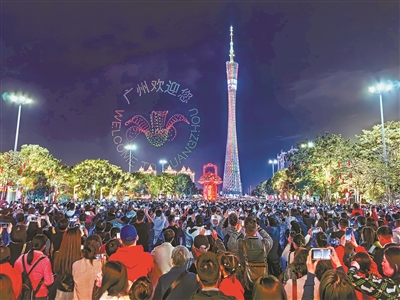 2月12日晚,花城廣場舉行無人機表演,市民游客共享視聽盛宴。數字技術與新春文旅活動跨界融合,讓來自五湖四海的游客享受到科技感滿滿的“廣州年”。