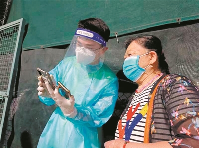 近日,奔赴抗疫一線的志愿者在協助檢查居民的健康碼等信息。