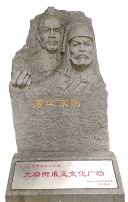緊鄰雕像旁邊的大塘街小學也在那時更名為“秉正小學”。這28米長的浮雕墻正是刻在了小學大門的兩邊圍墻上。從大門一進來,左手邊一處幽雅的微建筑引人注目:假山、翠竹環繞下有一方大理石蓮池,墻上“蓮潔而尊,人廉而正”的字樣在陽光下反射出柔和的光芒。