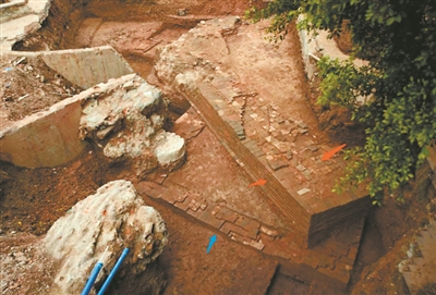 東濠涌遺址,越秀北路宋代城墻角臺(tái)基址。上層為宋代角臺(tái),下層為五代南漢時(shí)期城墻磚墻