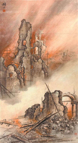 “和現實生活有關的,方才是有價值的藝術。”將“藝術大眾化”視為革命目標,傳統文人的“山林逸氣”對高劍父來說已顯得不合時宜。高劍父嘗試將“現代事物”如飛機、汽車、電線桿等引入中國畫中。他還特意乘機翱翔,在空中寫生。高劍父《東戰場的烈焰》堪稱其“藝術革命”具體、勇猛的實踐。該畫以1932年“一·二八”事變中被日軍炸毀后的上海閘北東方圖書館景象入畫:畫面上烈焰沖天,火光熊熊,遍地斷壁殘垣,令人觸目驚心。《東戰場的烈焰》直接讓時局大事進入中國畫,可謂首開先河。
