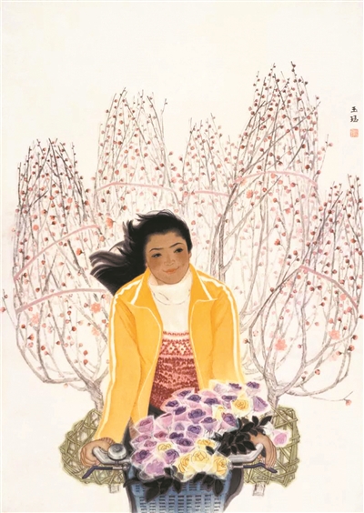 作為嶺南畫派一員,雖然沒有畫過“鴻篇巨制”,王玉玨的作品一樣讓人感受到地域的特色和時代的氣息。上世紀八十年代,王玉玨以一幅《賣花姑娘》獲得第六屆中國美展銀獎。“當時我到順德一個農場采風,在花場里看到姑娘們騎著自行車去送花,那種帶著希望、帶著笑意,如春風撲面而來的韻味瞬間就‘抓’住了我。”最初她用宣紙、用絹來畫,但都畫不出她想要的效果,于是又另辟蹊徑,買了“的確涼”布來畫,出來的效果還受到了關山月的稱贊。