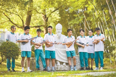 課后時(shí)間,二中學(xué)生們在校園里彈琴唱歌。