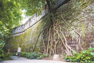 20世紀初,除鎮海樓外,明城墻只剩下高低不等的殘垣。1918年-1922年,廣州修筑馬路,這段位于越秀公園內的城墻與交通規劃無礙,因此得以保留下來。1987年7月至12月,重修鎮海樓范圍內180米古城墻,恢復明式雉堞;2012年起,全長1179米的明代廣州古城墻(越秀山段)實現邊修復邊開放。如今,炮火與煙灰早已隨風而逝。記者沿著城墻一路走來,只見墻根下是悠然散步的市民,還有人在踢毽子、下棋、跳舞……驀然回首,那石縫中冒出嫩芽的墻垣,無聲訴說著歲月的滄桑印記。