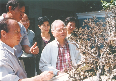 1999年10月,著名畫家關山月等在觀賞一株百齡盆景樹