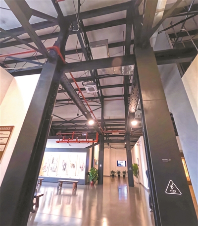廠房內部采用當時最先進鉚釘聯(lián)接鋼材的鋼構梁柱方式與鋼筋砼剪力墻組合體系,既解決了生產(chǎn)廠房的大跨度難題,又消除了機器震動對結構的不利影響。在博物館四樓,抬眼向上望去,天花板下鋼構梁架縱橫交叉。在博物館的一樓大廳里,幾條工字鋼柱頂天地矗立其中,成為最醒目的“展品”。