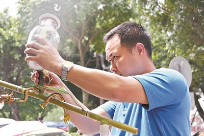 記者現場看到,兩根手指粗細的“色梗”通過一個小小的接觸面粘在一起,卻不留痕跡。很難相信,它能撐起一個或幾個約15千克重的孩子!黎偉明說,鍛造好的“色梗”很結實,不用擔心會折斷。看似或坐或站的演員其實都坐在特制的坐兜或座椅上,足夠牢固。不過,“色梗”和坐兜都被精心偽裝,一般人難以發現。