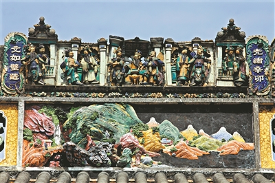 陳家祠的陶塑脊飾是著名的佛山石灣陶塑,俗稱“石灣瓦脊”。陳家祠共有11條陶塑脊飾,由文如璧、吳奇玉、寶玉榮等佛山著名陶塑商號制作,日曬雨淋也不易褪色。