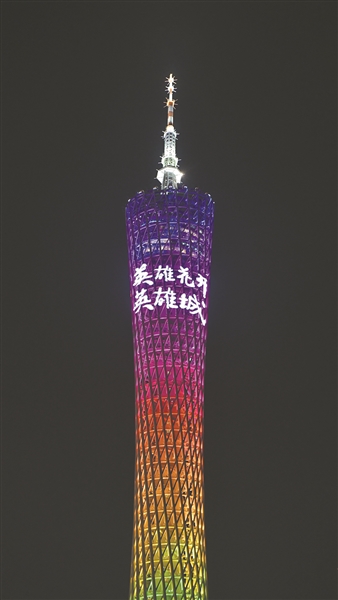 廣州塔上滾動播放“英雄花開英雄城”2023廣州傳承弘揚紅色文化系列活動標語