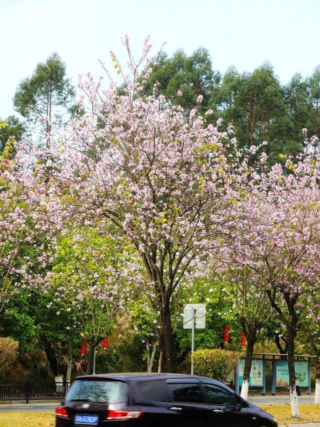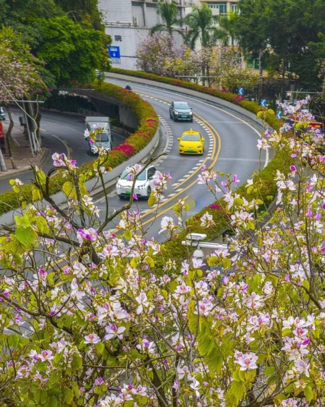 在增城的府佑路、新城大道等城市主干道上,宮粉紫荊迎來了茂盛期。