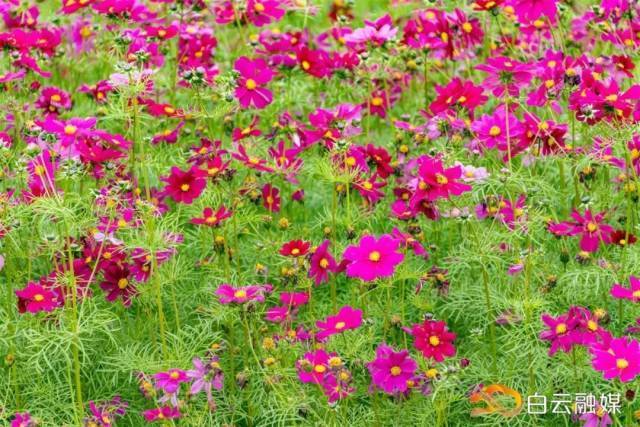 成片的波斯菊怒放,紫紅、粉紅或白的