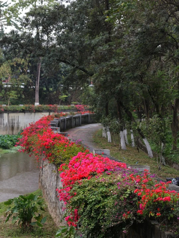 三角梅、宮粉紫荊、黃花風鈴、炮仗花……越過青青草地,在校園里閑逛,勾起青澀的青春回憶。