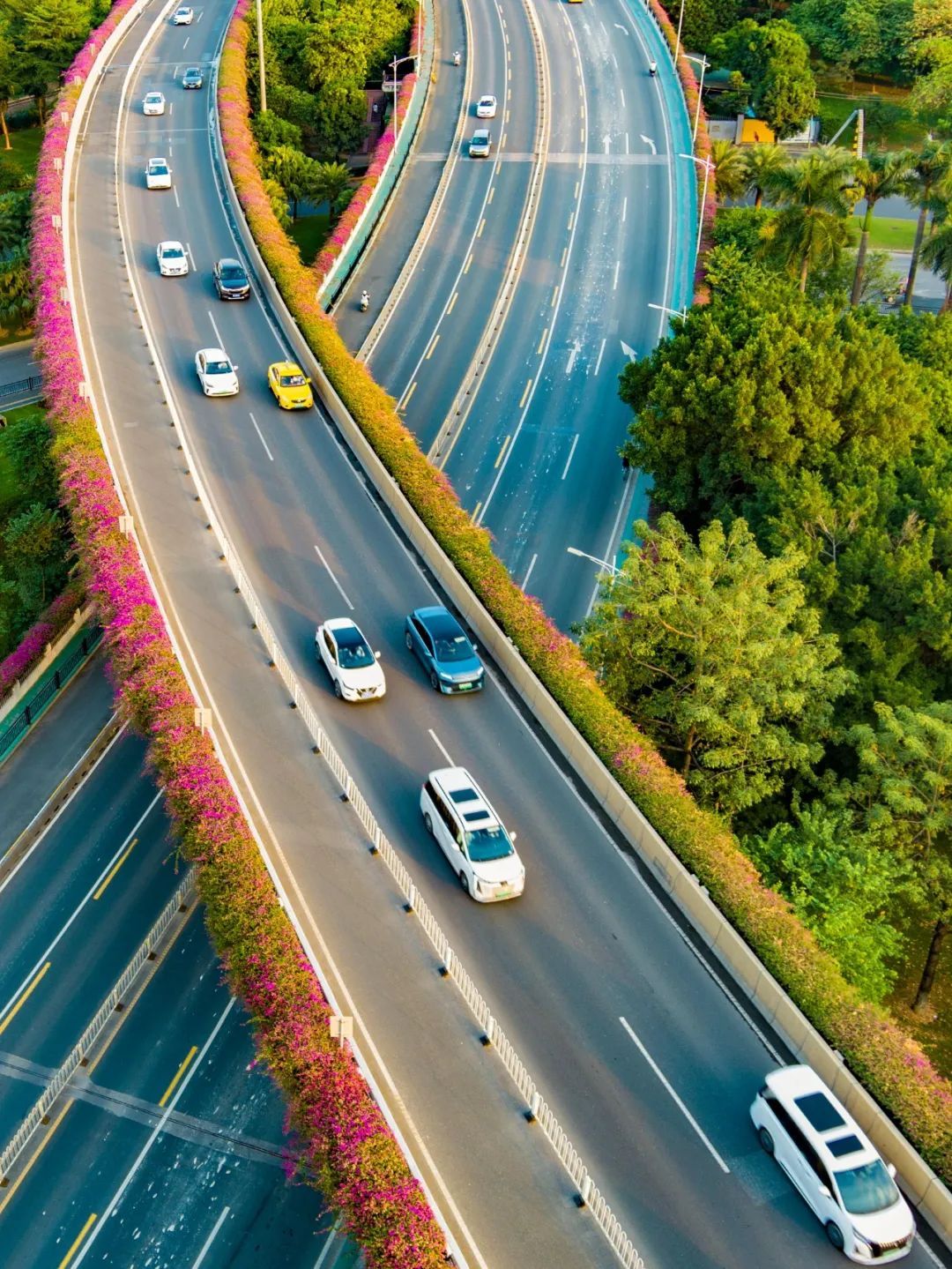 黃埔區(qū)茅崗立交橋兩側(cè)的簕杜鵑盛開,車輛從開滿簕杜鵑的立交橋上駛過。