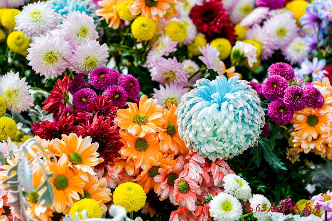 “滿樹繁花獨一枝”的大立菊早已在羊城菊會聞名于世。這一屆羊城菊會帶來了新的驚喜——“滿樹彩花獨一株”的多彩菊樹在羊城首度登場了。它通過將多個優秀的品種菊嫁接于同一株青蒿上,得益于青蒿強壯的母體,品種菊茁壯生長具備良好的抗性,形成高大的樹狀形態。當彩菊盛開時,炫彩奪目,猶如煙花綻放。除了多彩菊樹,還有彩色菊球,本次羊城菊會首次推出多彩菊球,它將多個優選品種菊栽培于同一容器,通過悉心栽培、精心整形、同步調節花期。彩色菊球既有大立菊霸氣的整體外形,也有品種菊多彩艷麗的鮮明個性。菊球直徑超過1.2米,花型豐富、色彩斑斕。