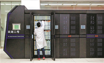 工作人員為“天河二號(hào)”超級(jí)計(jì)算機(jī)作檢測(cè)。