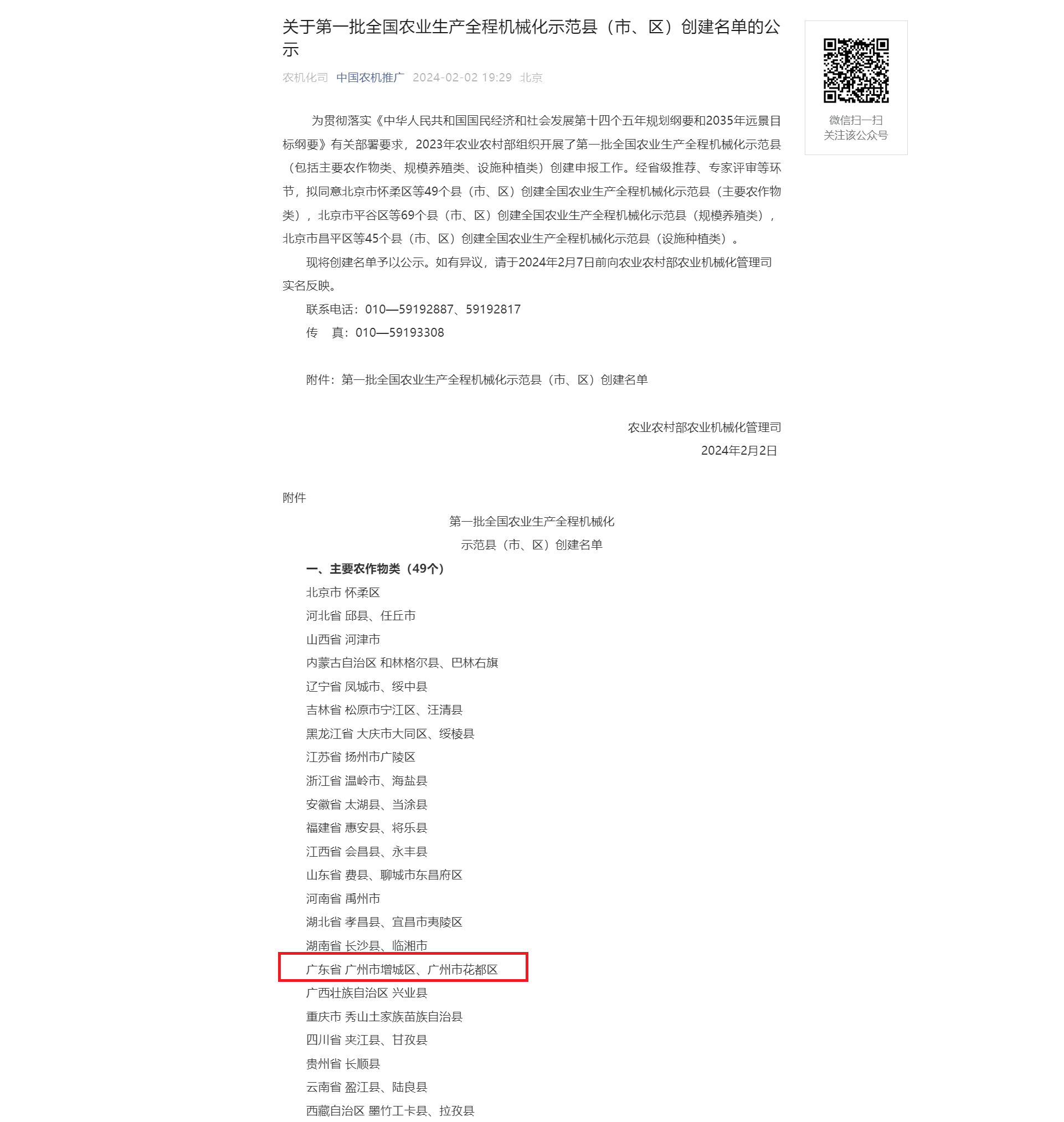 據了解,2024年農業農村部組織開展了第一批全國農業生產全程機械化示范縣(包括主要農作物類、規模養殖類、設施種植類)創建申報工作。在縣級擇優申報、市級現場復核、省級初評推薦的基礎上,經農業農村部現場抽查和專家審核復評、媒體集中公示,增城區從全國眾多縣(市、區)中脫穎而出,成功入選第一批全國農業生產全程機械化示范縣創建名單。