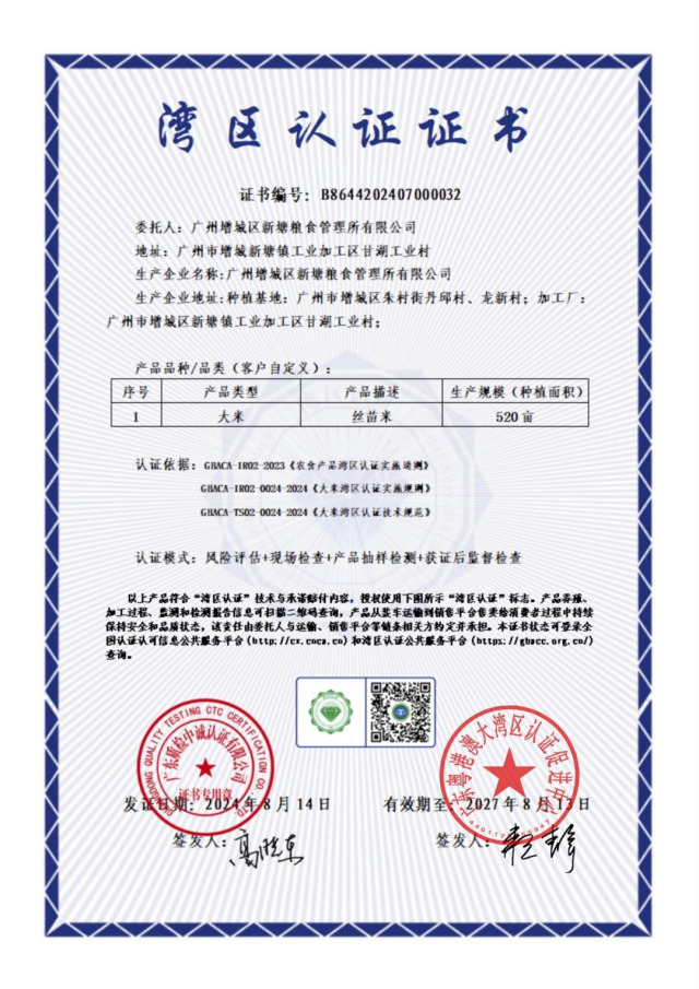 近日,廣州市市場監管局組織并推動開展的全市地理標志產品灣區認證中,增城絲苗米獲頒《灣區認證證書》。增城絲苗米成為廣州首個獲得“灣區認證”的地理標志產品。