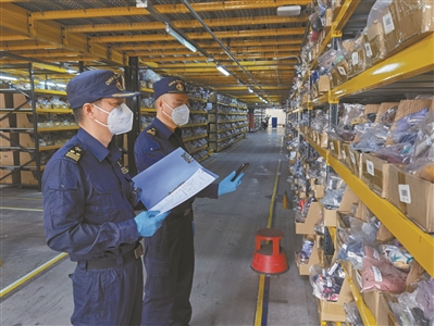 海關關員在南沙自貿試驗區內的跨境電商出口退貨中心倉進行監管