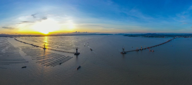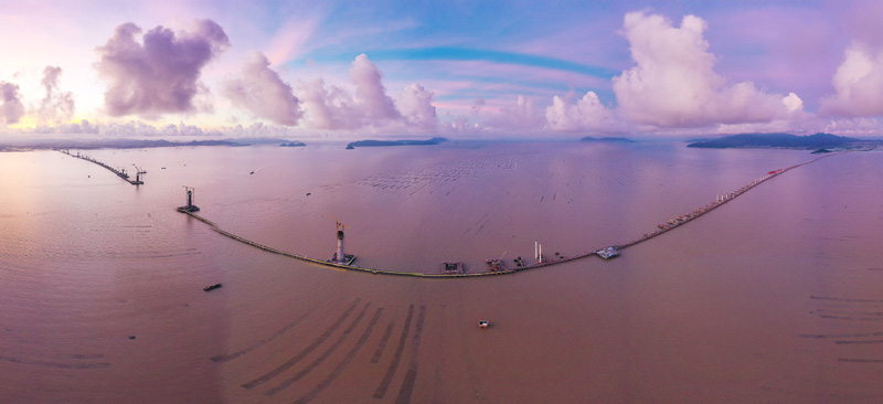 建設中的黃茅??绾Mǖ溃?月28日攝,無人機全景照片)。黃茅??绾Mǖ罇|起珠海市平沙鎮,西接江門市斗山鎮,橫跨珠江口崖門入海口黃茅海水域,線路全長約31公里,預計2024年建成通車。
