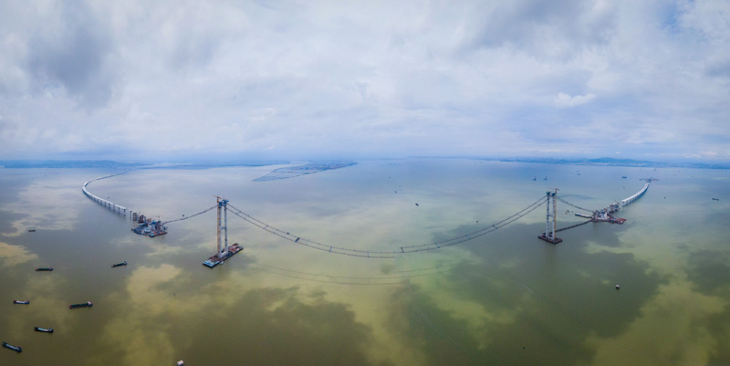 建設中的深中通道伶仃洋大橋(6月7日攝,無人機全景照片)。深中通道全長24公里,集橋、島、隧、地下互通為一體,連接珠江口東西兩岸的深圳市和中山市,預計2024年建成通車。