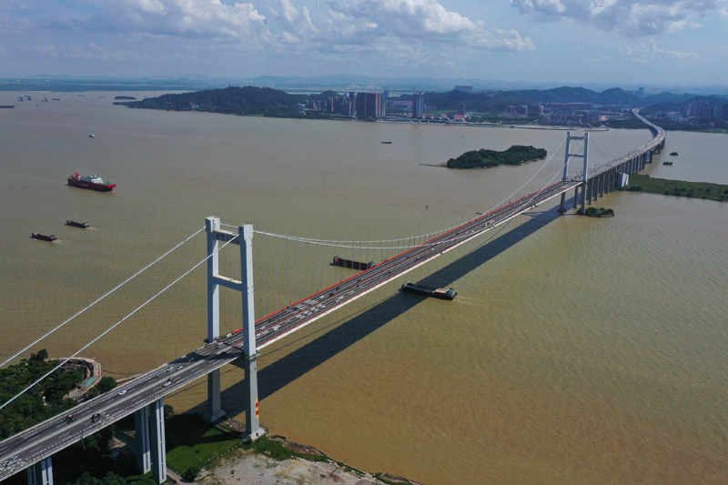 虎門大橋全景(2020年6月23日攝,無人機照片)。虎門大橋橫跨珠江口獅子洋水道,連接廣州市南沙區與東莞市虎門鎮。
