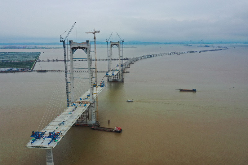 建設中的黃茅??绾Mǖ溃?月27日攝,無人機全景照片)。黃茅??绾Mǖ罇|起珠海市平沙鎮,西接江門市斗山鎮,橫跨珠江口崖門入海口黃茅海水域,線路全長約31公里,預計2024年建成通車。