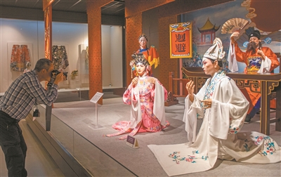 粵劇藝術(shù)博物館的“廣福臺”上,正好上演《花田錯(cuò)會》《花木蘭巡營》等劇目。悠揚(yáng)的粵聲與淅瀝的雨聲相和,吸引了攝影家和游人駐足。博物館內(nèi)豐富精美的粵劇展品,特別是難得一見的華美戲服,吸引攝影家們紛紛按下快門。