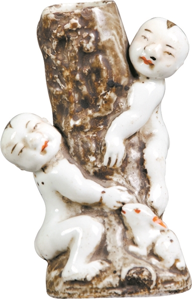 廣州起義紀念館中,收藏著一件小筆筒:兩個光屁股的小童,抱著一棵大樹的樹墩部分,正在高興地玩耍。樹根部分,還臥著一只眼紅嘴紅耳朵紅的小兔子。
