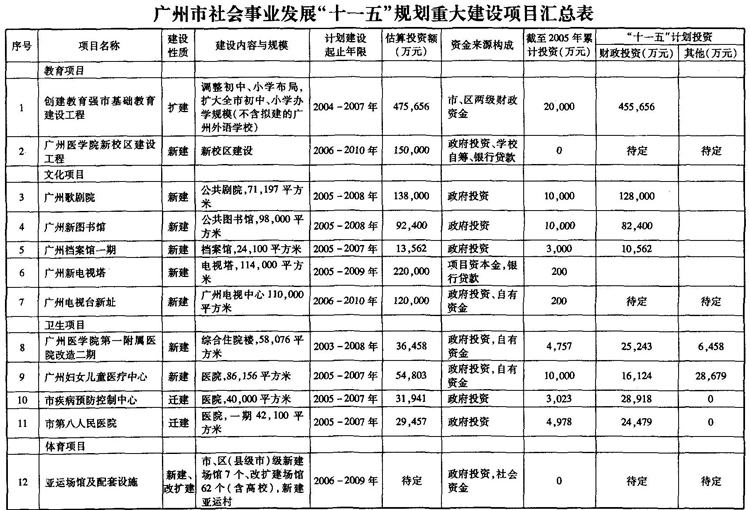 建設一批社會事業(yè)重大項目,提高社會事業(yè)發(fā)展承載力。“十一五”期間,重點推進創(chuàng)建教育強市基礎教育建設工程、廣州醫(yī)學院新校區(qū)建設工程、廣醫(yī)一附院改造工程、市第八人民醫(yī)院、市疾病預防控制中心遷建工程和市婦女兒童醫(yī)療中心、廣州歌劇院、廣州新圖書館、廣州檔案館一期、廣州新電視塔、廣州電視臺新址工程以及亞運會場館及其配套設施等一批重大項目。