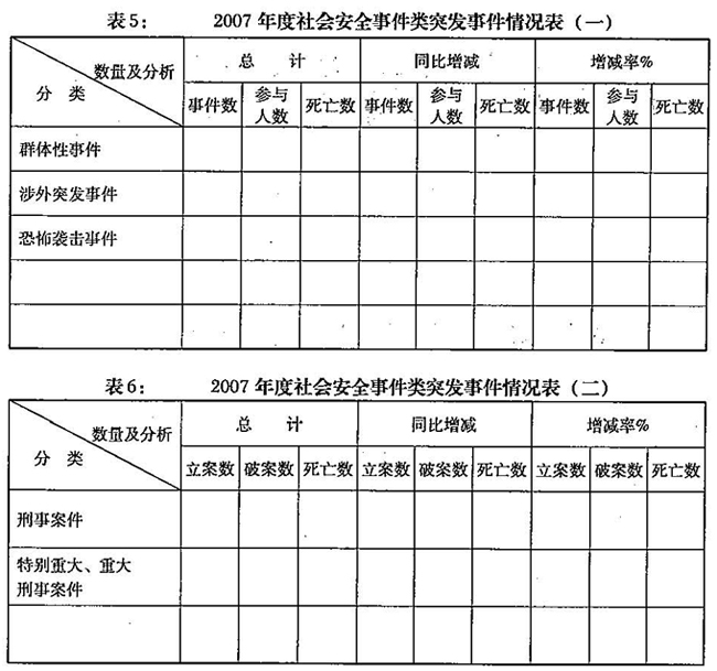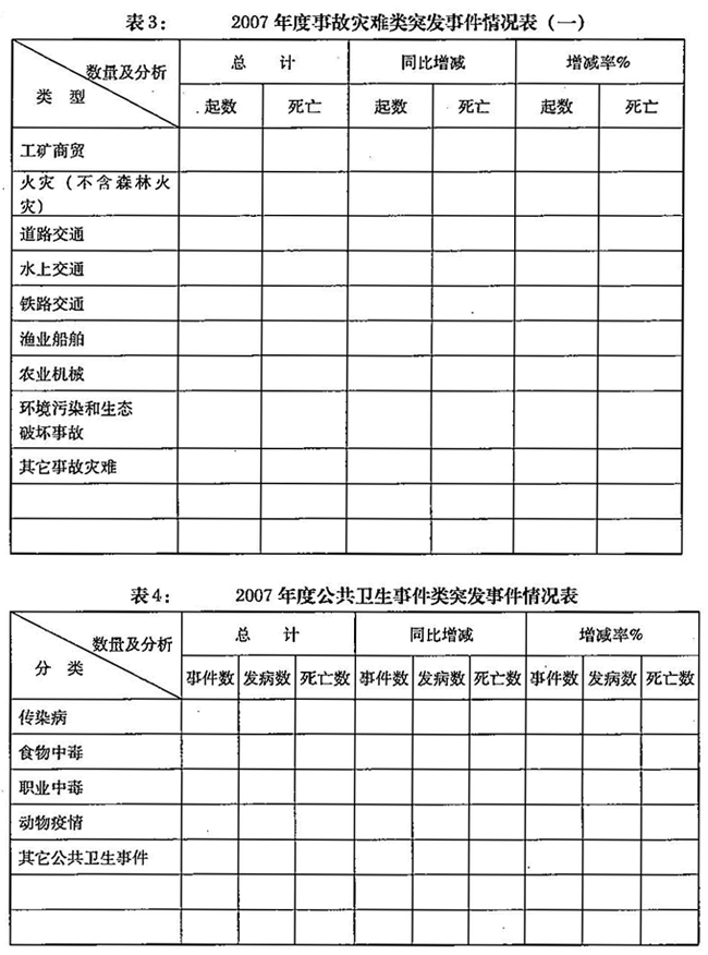 按照自然災害、事故災難、公共衛生事件和社會安全事件四大類,分別匯總總體情況及其所包含分類別的具體情況。主要包括2007年各類突發事件發生起數、傷亡人數、經濟損失、與往年比較情況,以及特別重大、重大、較大三個級別的有關情況等,并對各類突發事件發生的主要特點進行分析。