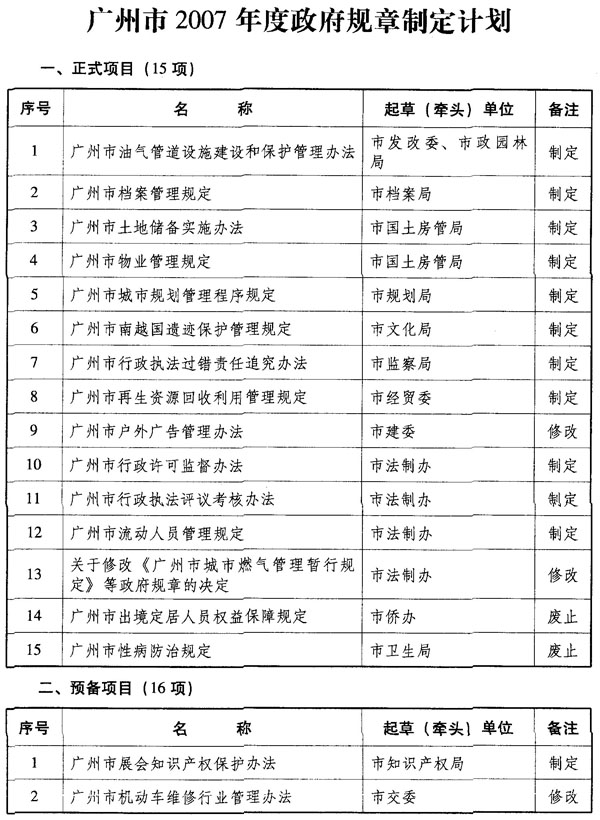 《廣州市2007年度政府規章制定計劃》已經2007年1月8日第12屆125次市政府常務會議討論通過,現印發給你們,并提出以下意見,請依照執行。