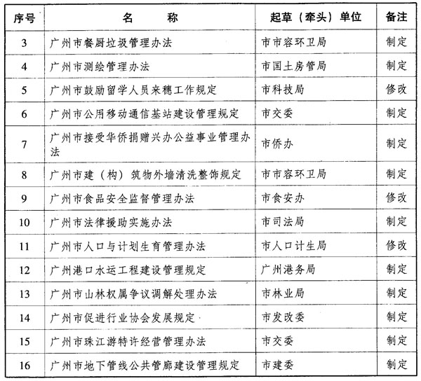 一、加強組織領導,建立健全立法責任制。各計劃項目的起草單位要按照《廣州市人民政府規章制定辦法》(市政府令2002年第7號)第十二條、第十三條、第十四條規定的要求,及時上報有關資料。