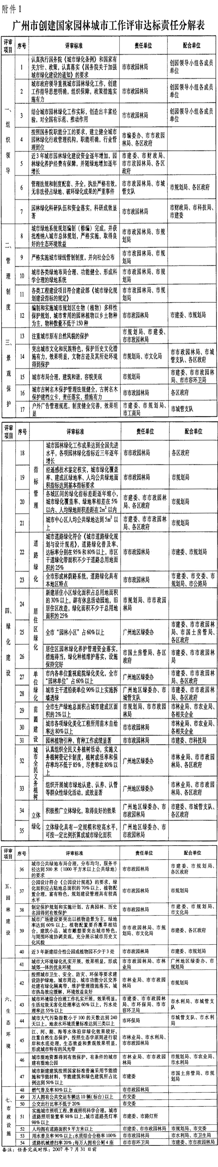 見廣州市創建國家園林城市工作評審達標責任分解表(附件1)及廣州市創建國家園林城市資料收集分工表(附件2)。