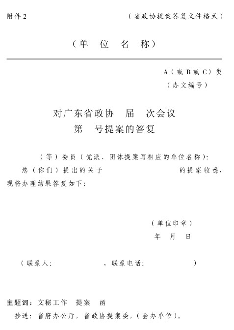 (三)省政協提案,由承辦單位將辦復意見代擬稿送市府辦公廳。由市府辦公廳綜合其他會辦單位意見后,屬于市政府主辦的,將答復文件寄送提出提案的委員(或單位)各1份;屬于市政府會辦的,將辦理意見送主辦單位。答復文件或辦理意見同時抄送省府辦公廳、省政協提案委和承辦單位各1份。