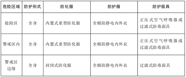 ②按警戒區域劃分設立警戒標志,根據所劃分的區域做好相關防護,同時防止灼傷或凍傷,重點要避免人員進入低洼處或密閉空間內(如污水溝、下水道等)。