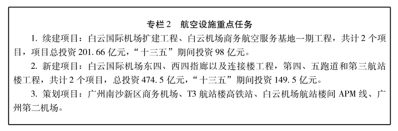 ——提升機場樞紐功能。(1)完善機場基礎設施。力爭2018年建成白云國際機場第二航站樓,推進第三航站樓、第四第五跑道、第二國際貨站的建設,積極推進城際(市)軌道交通、高快速路等引入白云國際機場,有效提升機場集疏運能力,開展第二機場規劃選址,強化白云國際機場對中南地區機場群的龍頭作用。(2)強化機場航線網絡。力爭把白云國際機場建設成為亞洲核心航空樞紐,進一步做大做強中轉航線市場,增加國內中轉航線數量,加密重點航線;鞏固、新增和培育國際直飛航線市場,開通國際航線150條,形成以白云機場為核心的“樞紐—干線—支線”機場網絡,加強和優化國際—國內中轉的銜接性。(3)提高機場運行效率。鼓勵國內外有實力的航空公司、航空物流運營商在白云機場設立基地,提高航班密度,打造空中快線和航班;并通過搭建以廣州為起點的“空中絲路”,與國內、東南亞主要城市形成“4小時航空交通圈”,與全球主要城市形成“12小時航空交通圈”。(4)加強機場內部及周邊服務的綜合整治,提高機場綜合運輸服務水平。