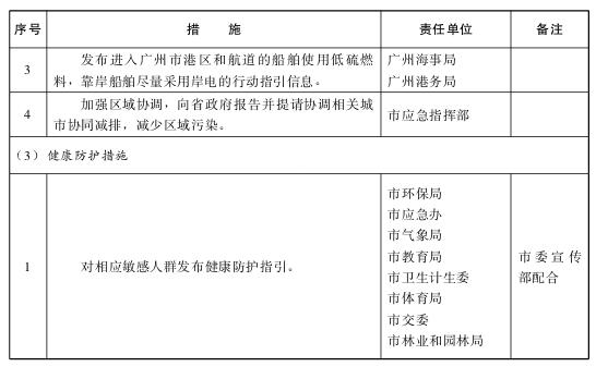 (17)廣州港務(wù)局:負(fù)責(zé)加強(qiáng)到港船舶岸電使用和港口堆場(chǎng)揚(yáng)塵污染控制,督促港口碼頭等人員密集場(chǎng)所做好環(huán)境空氣重污染預(yù)警信息的接收和傳播工作,在嚴(yán)重污染情況下開展港口船舶流量調(diào)控。