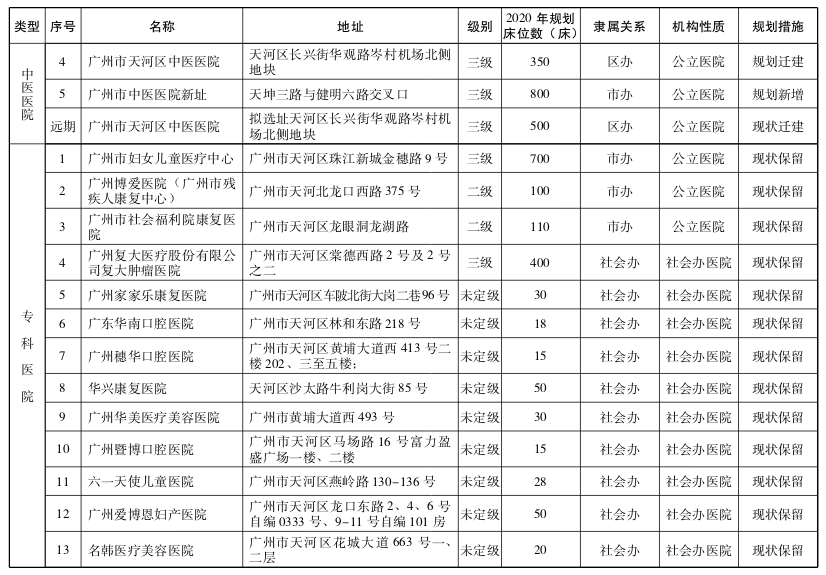 2020年,廣州市共規劃中醫醫院(中西醫結合醫院)40間,其中現狀保留19間,規劃新增3間,改擴建(含遷建)18間。