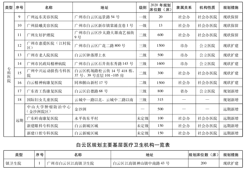 2020年,廣州市共規劃綜合醫院169間,其中現狀保留87間,規劃新增22間,改擴建(含遷建)60間。