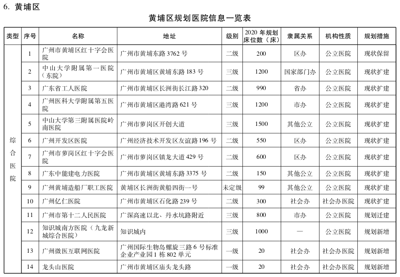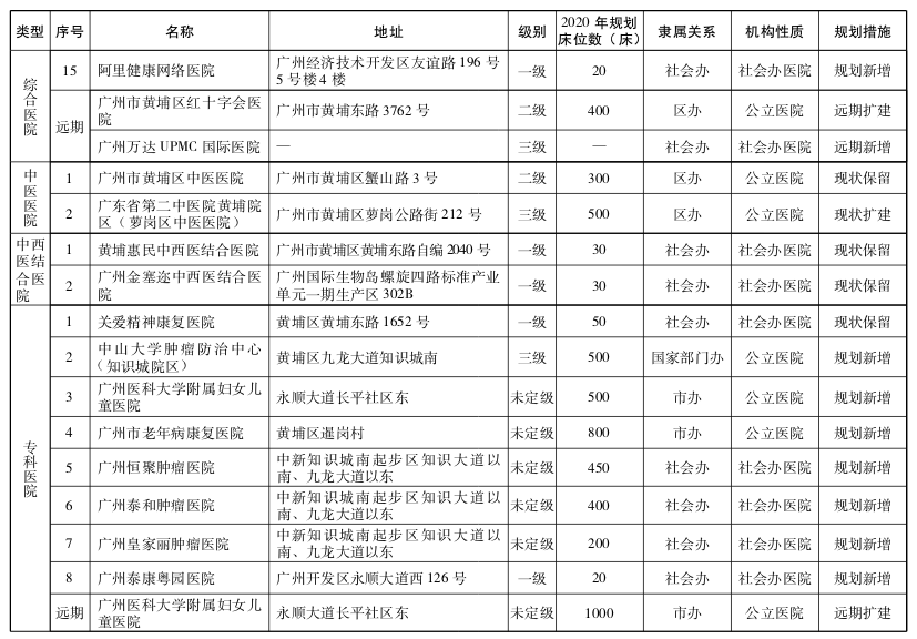 黃埔區為擴容提質區。調整黃埔南部醫療資源布局和結構,重點增加黃埔北部綜合、婦女兒童、腫瘤、康復等公立醫療資源配置;鼓勵社會資本設置第三方檢驗檢測、腫瘤、老年護理、康復、健康管理、互聯網醫院等醫療機構;至少設置1家護理院、康復醫院或醫養結合機構;大力發展健康產業,建設廣州科學城、廣州國際生物島、中新廣州知識城。