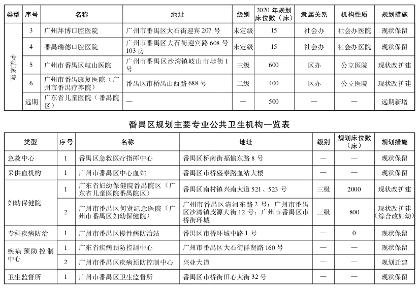 番禺區為擴容提質區。重點調整區域醫療資源布局和結構,有針對性地增加婦女兒童、中西等專科配置,除現有建設項目外,嚴控公立醫院規模、床位不合理擴張;增加基層醫療衛生機構數量;鼓勵社會資本引進國際化高端醫療資源;支持區內資源富余的二級以下公立綜合醫院,逐步轉型為護理院、康復醫院或者社區衛生服務機構,至少設置1家護理院、康復醫院或醫養結合機構。