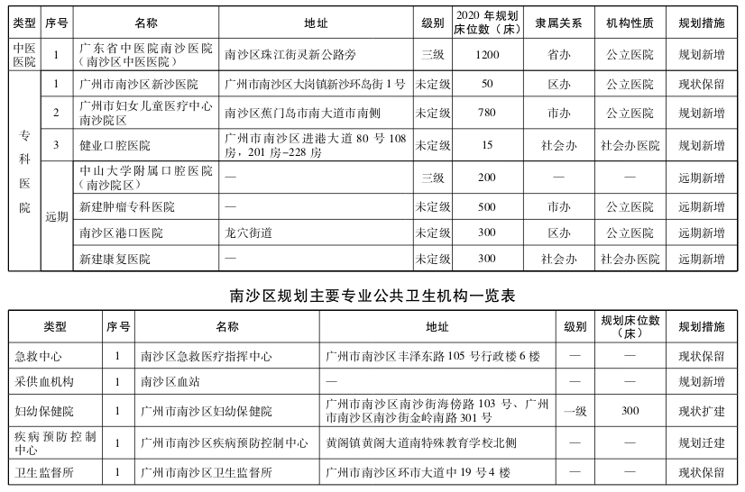 南沙區為擴容提質區。加大對區域醫療資源的配置力度,增加綜合、婦女兒童、口腔、腫瘤、中醫等醫療資源;至少設置1家護理院、康復醫院或醫養結合機構;鼓勵社會資本引進國際化高端醫療資源,以國際化視野和服務標準建造集臨床醫療、健康管理、特色專科聚集的,立足港澳、輻射東南亞的高端醫療產業鏈,建設南沙新區國家健康醫療旅游示范基地。允許南沙區在現有規劃基礎上,規劃新增1家以上綜合或專科醫院。