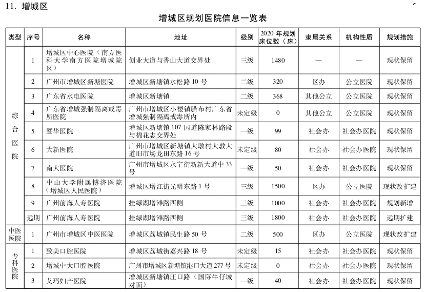 增城區為擴容提質區。加大對區域醫療資源的配置力度,重點增加綜合、婦女兒童等公立醫療資源配置;鼓勵社會資本引進引進婦產、老年護理、康復、口腔等醫療機構;至少設置1家護理院、康復醫院或醫養結合機構;建設增城高灘健康小鎮。允許增城區在現有規劃基礎上,規劃新增1家以上綜合或專科醫院。