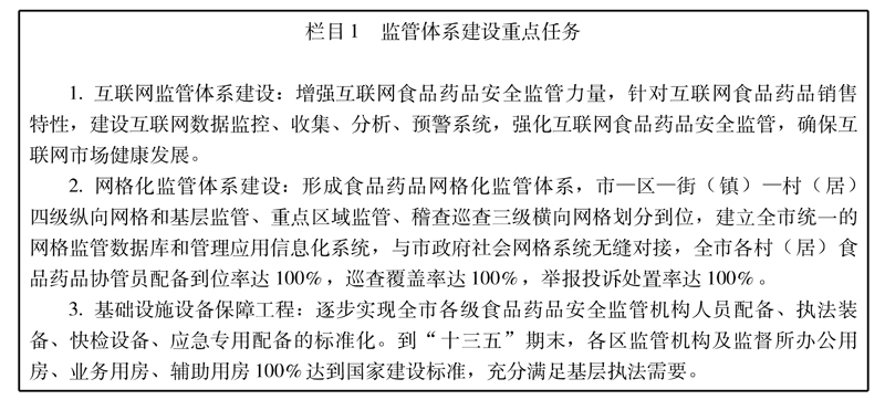 ——統一監管機構更加完善。鞏固和優化市、區、街(鎮)三級食品藥品監管體制機制,強化重點領域、重點環節、重點市場的監管覆蓋。各級食品藥品監管機構基礎設施建設及裝備配備達到或超過國家、省相關標準,充分滿足基層執法需要。