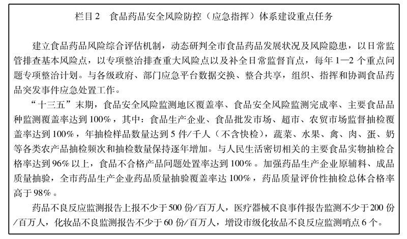 整合全市食品藥品安全風險監測行政與技術資源,以市、區、街(鎮)三級食品安全風險監測及食源性疾病監測網絡為核心,強化食品藥品監督抽檢機制。拓展藥品(醫療器械)不良反應(事件)基層監測網絡,加快建設化妝品不良反應監測哨點。健全完善統一高效的投訴舉報渠道。