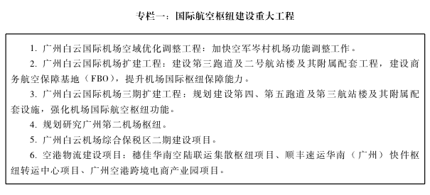 緊抓我國實(shí)施“一帶一路”、自由貿(mào)易試驗(yàn)區(qū)建設(shè)和加快民航業(yè)發(fā)展等重大戰(zhàn)略機(jī)遇,著力提升白云機(jī)場(chǎng)國際航空樞紐地位,著力建設(shè)生態(tài)智慧現(xiàn)代空港區(qū),著力發(fā)展臨空高端產(chǎn)業(yè),著力推進(jìn)體制機(jī)制創(chuàng)新。圍繞打造粵港澳大灣區(qū)世界級(jí)機(jī)場(chǎng)群,以廣州白云國際機(jī)場(chǎng)為龍頭,規(guī)劃研究廣州第二機(jī)場(chǎng),預(yù)留通用機(jī)場(chǎng),構(gòu)建國際航空樞紐體系。